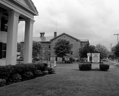 The two buildings sit about 20 yards apart across a parking lot: The red brick structure houses the municipal offices of the village of Greenwich, while the white-columned building next door is home to offices of the town of Greenwich.