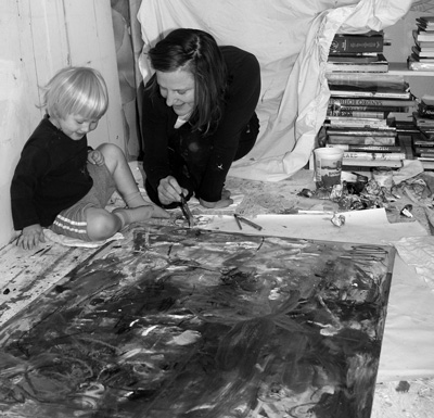 The artist Renee Bouchard has lately been inviting her 2-year-old son, Ensor, to share in her creative process. The result is a series of paintings that will be on display at two locations in downtown Bennington this summer and fall. Courtesy photo/Jamie Franklin