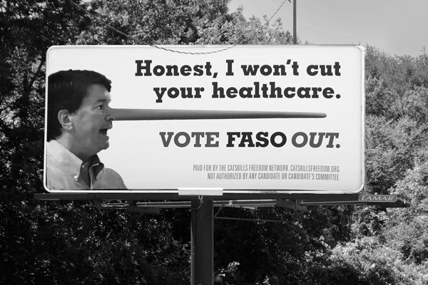A billboard along Route 20 west of New Lebanon, N.Y., this summer cast U.S. Rep. John Faso, R-Kinderhook, as Pinocchio for his vote last year on health care reform. The ad was paid for by the Catskills Freedom Network, a group organized by activists from across the state line in Massachusetts. Courtesy photo