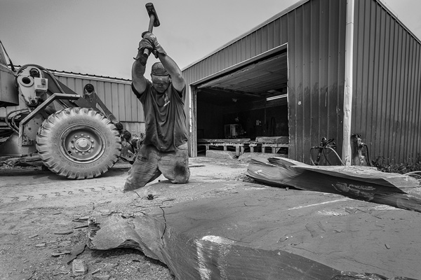 Tom Beebe hammers a large piece of slate so that it will be able to fit onto the processing belt at the Sheldon Slate Products facility in Poultney. Joan K. Lentini photo