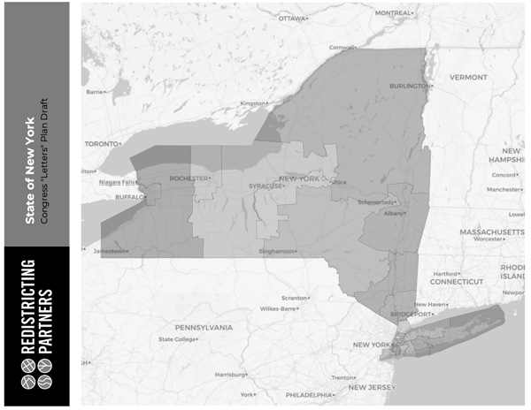 New York’s new Independent Redistricting Commission has put forth two alternatives for redrawing the state’s congressional districts. The map above was crafted by the panel’s Democrats, the one below by its Republicans.